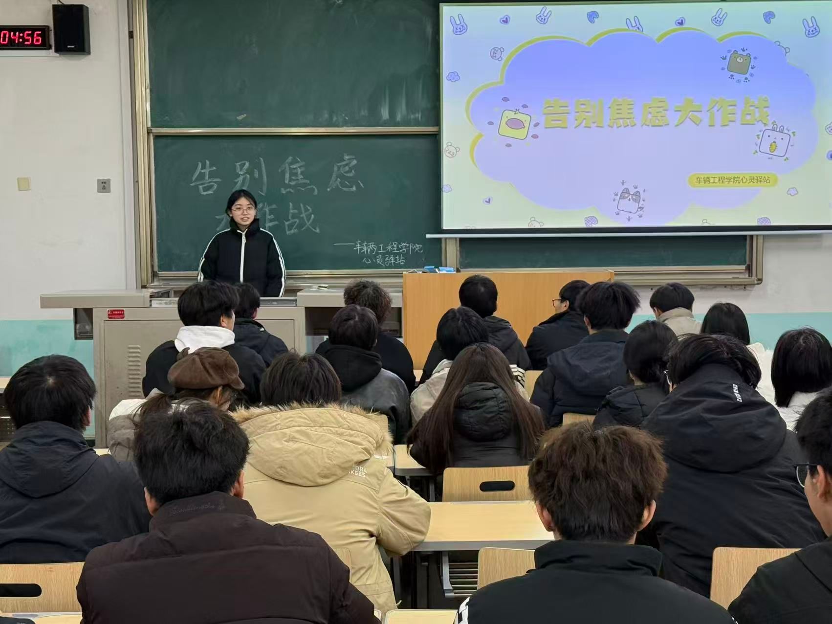 为深入贯彻落实“三全育人”理念,创新心理健康教育形式,将思政教育融入学生成长全过程,12月24日,车辆工程学院在阎科171教室成功开展“行走的思政课”系列之“告别焦虑大作战”心理减压工坊活动。活动旨在引导学生掌握科学的压力管理方法,在互动体验中实现自我认知与情绪调节。