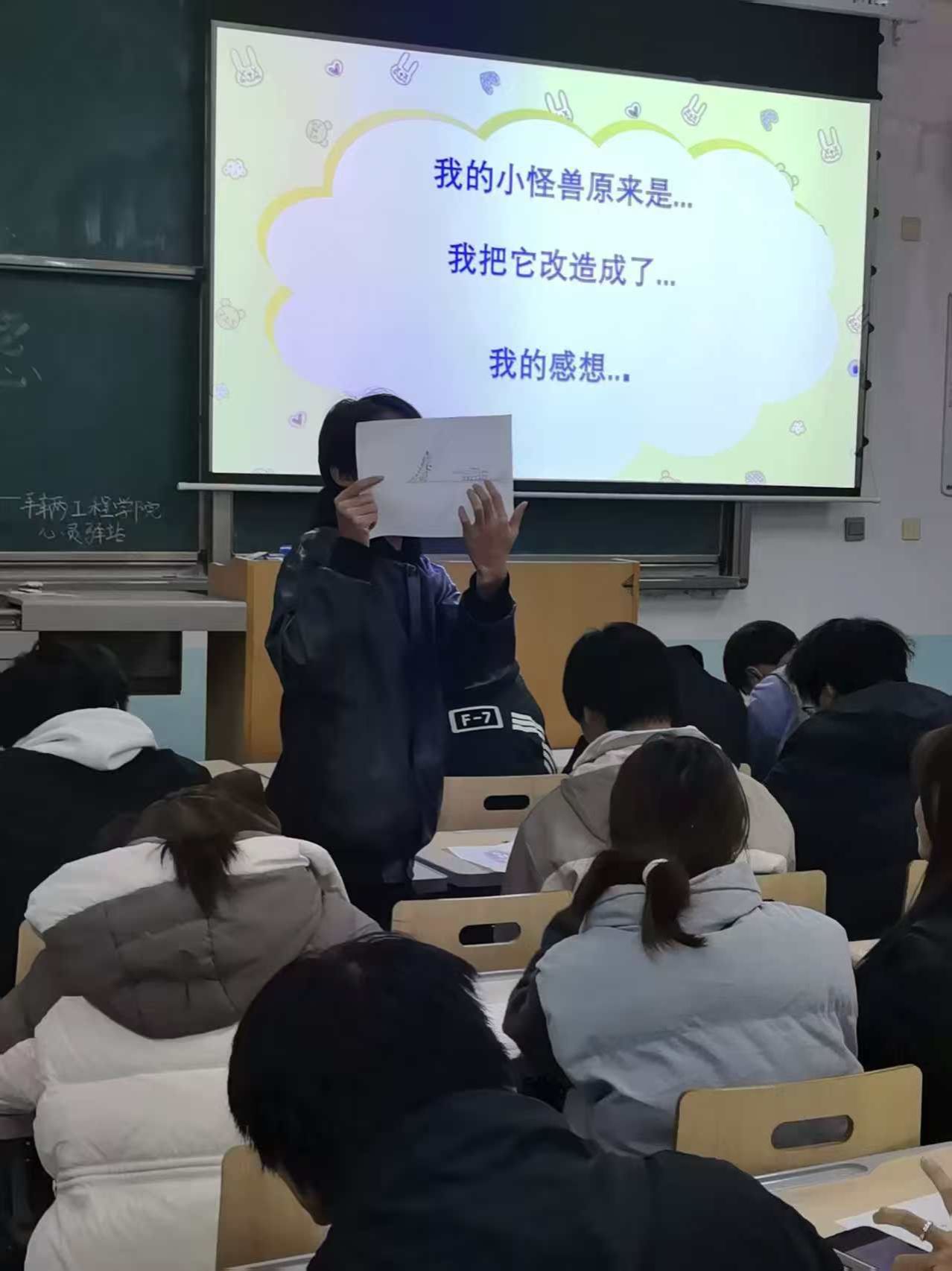活动在学院心灵驿站负责人帅清杨的引导下有序进行。同学们首先将学业、人际等多方面的压力具象化为个性化的“压力小怪兽”,随后通过绘画、手工等艺术形式进行创意改造,赋予压力以积极意义。在最后的分享环节中,同学们踊跃展示作品,讲述创作背后的情绪故事,在交流中实现情感共鸣与压力释放。现场气氛轻松热烈,笑声不断,体现了“在创作中宣泄,在欢笑中成长”的活动效果。